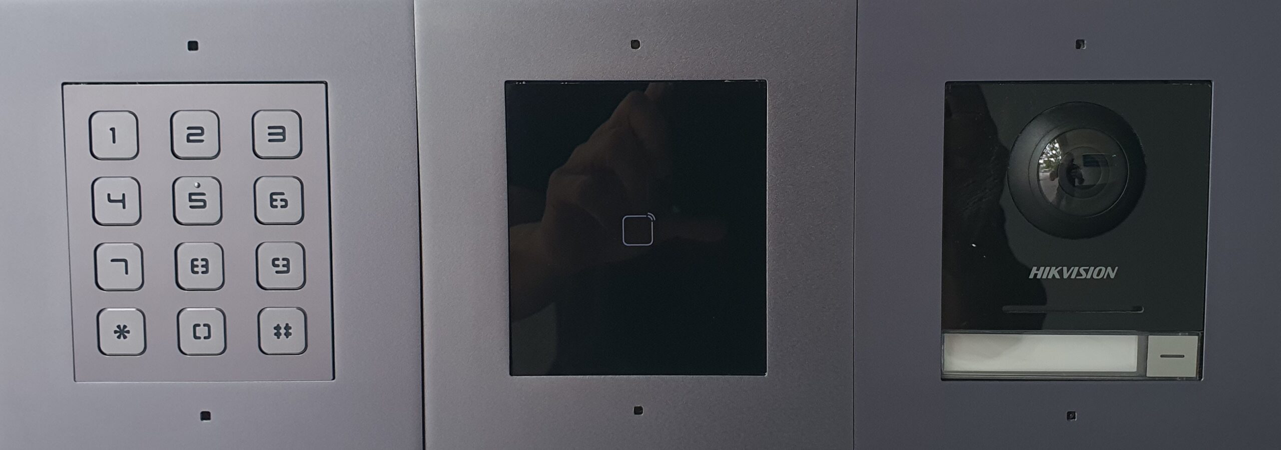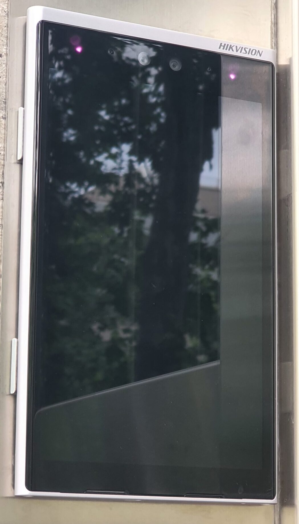 La placa de calle consiste en una pantalla de video portero táctil de 10 pulgadas con cámara incorporada que soporta autentificación mediante tarjeta, código pin y reconocimiento facial.